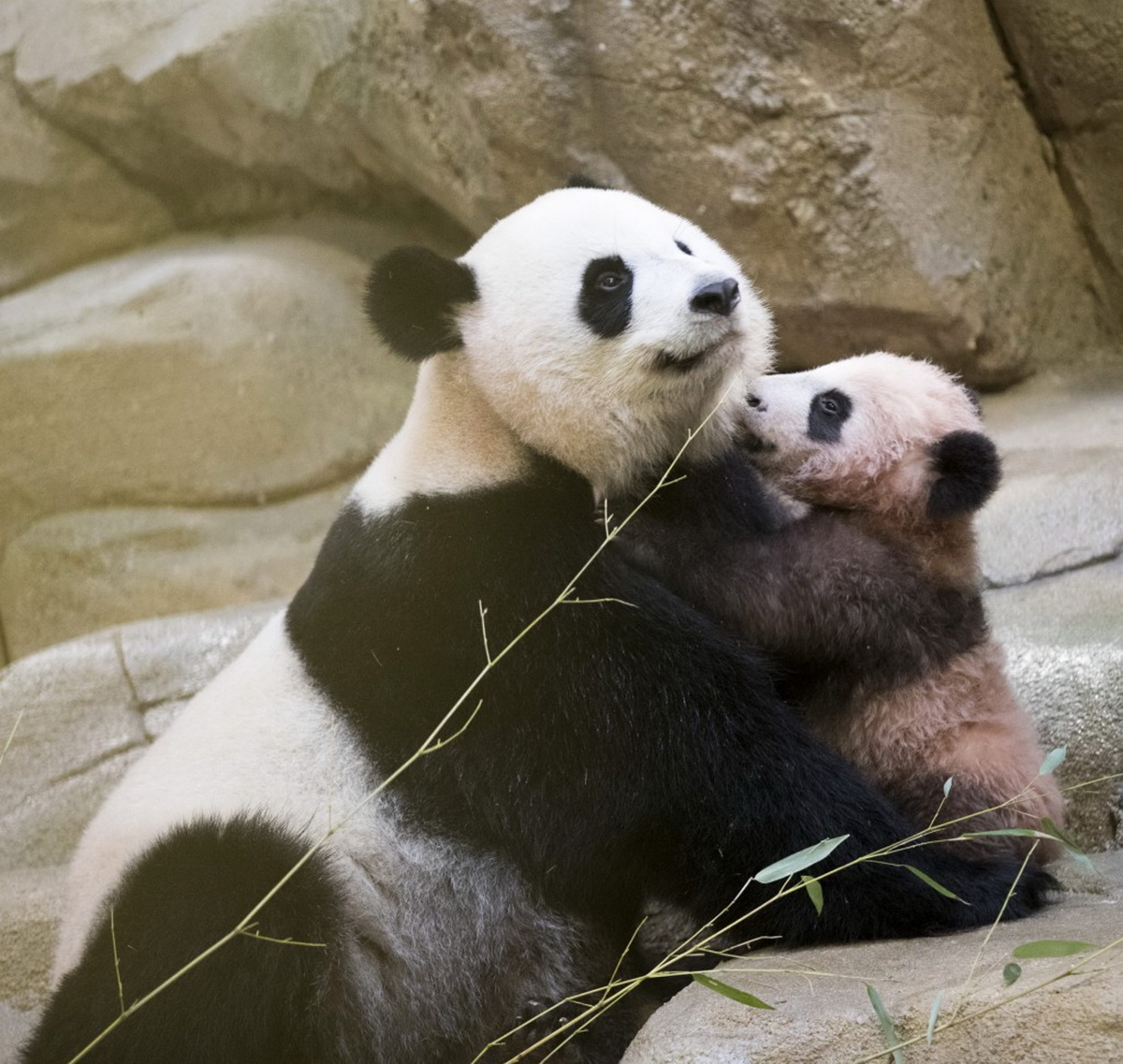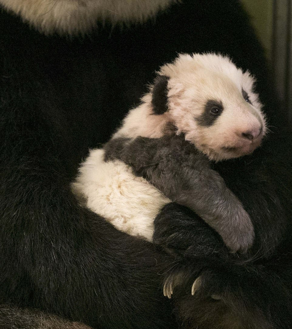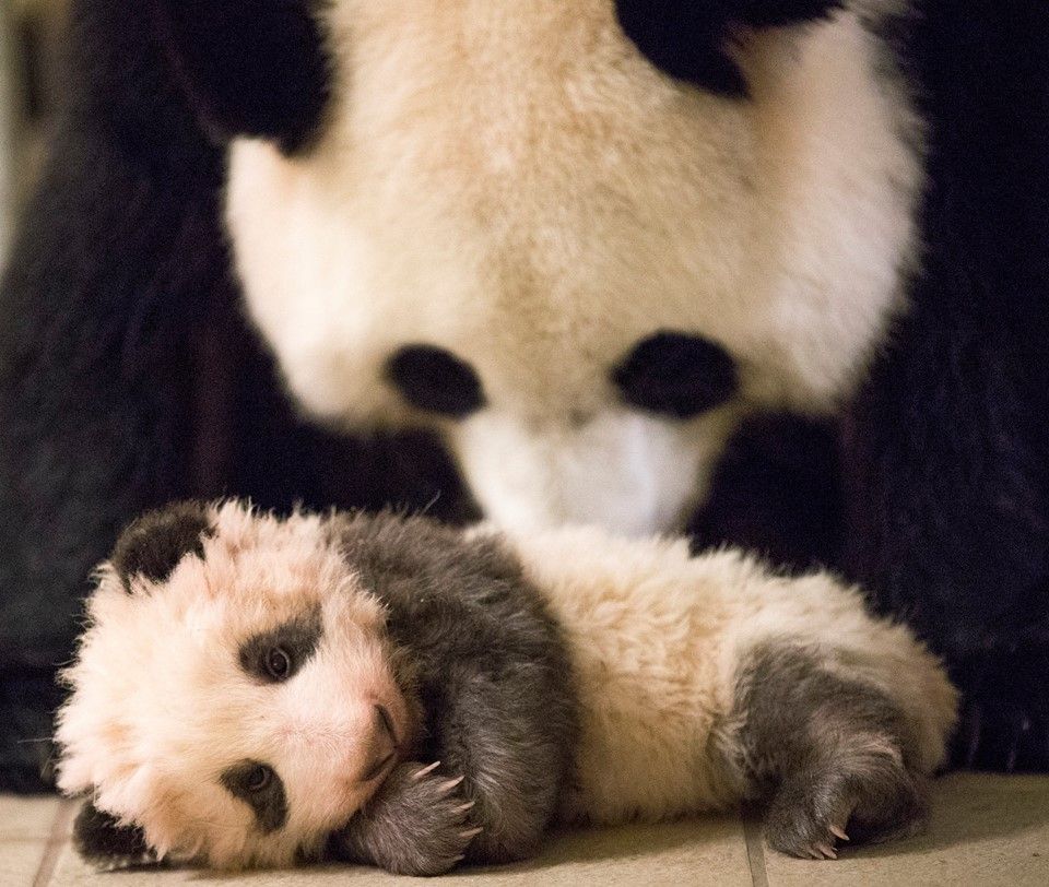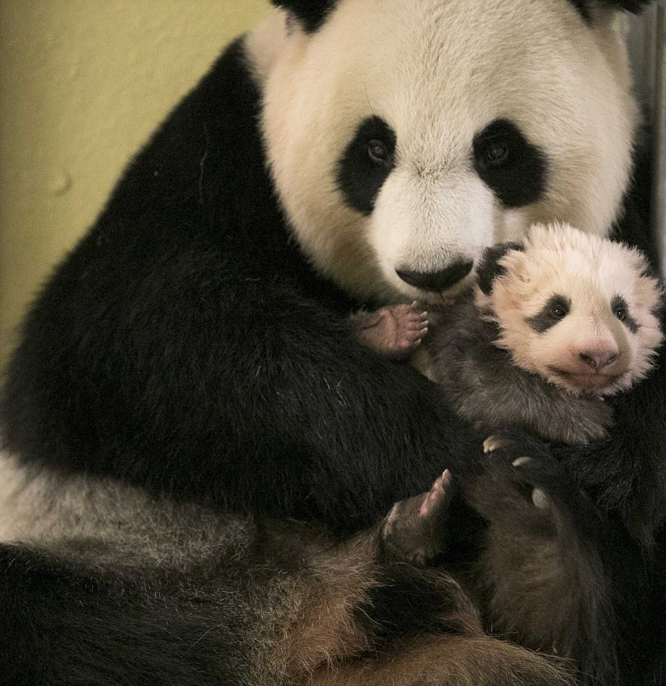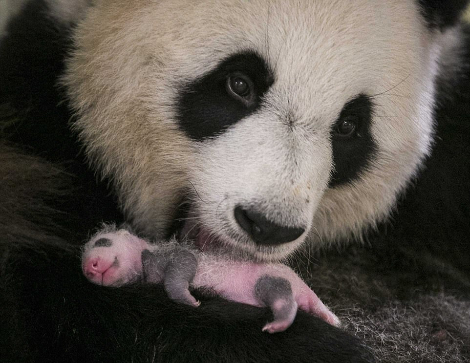 2017年8月6日,法国博瓦勒动物园,大熊猫“欢欢”和2天前产下的幼崽。