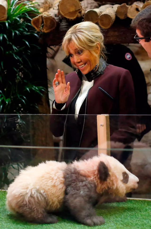 当地时间2017年12月4日,法国第一夫人在“圆梦”命名仪式上和她打招呼。布里吉特是大熊猫“圆梦”的教母,一直以来都对“圆梦”非常宠爱。