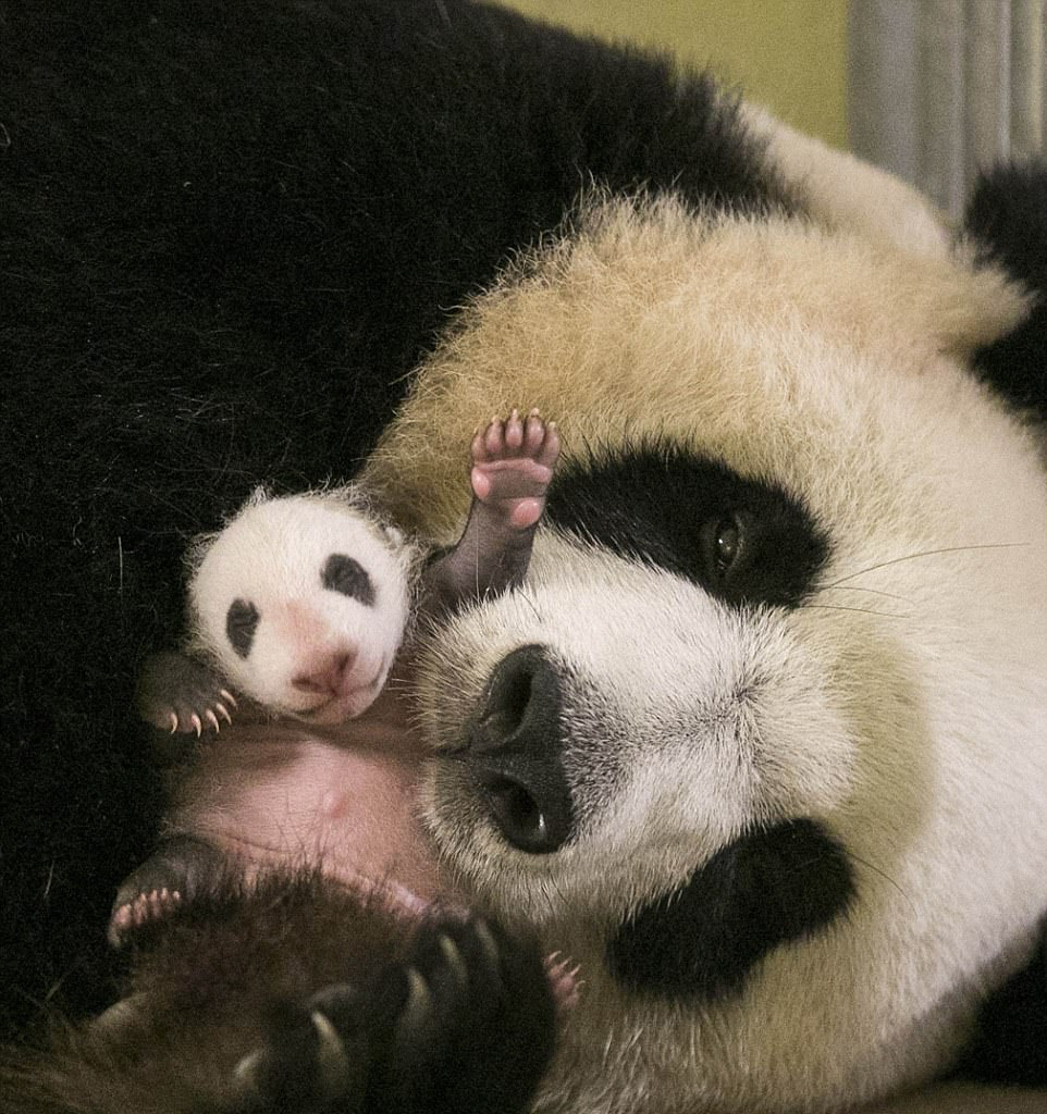 “迷你圆仔”躺在妈妈怀里,可以看到“欢欢”正在舔舐她的宝贝