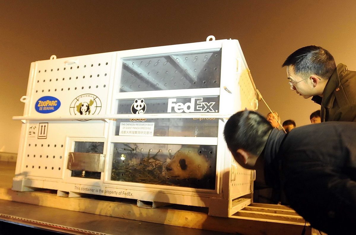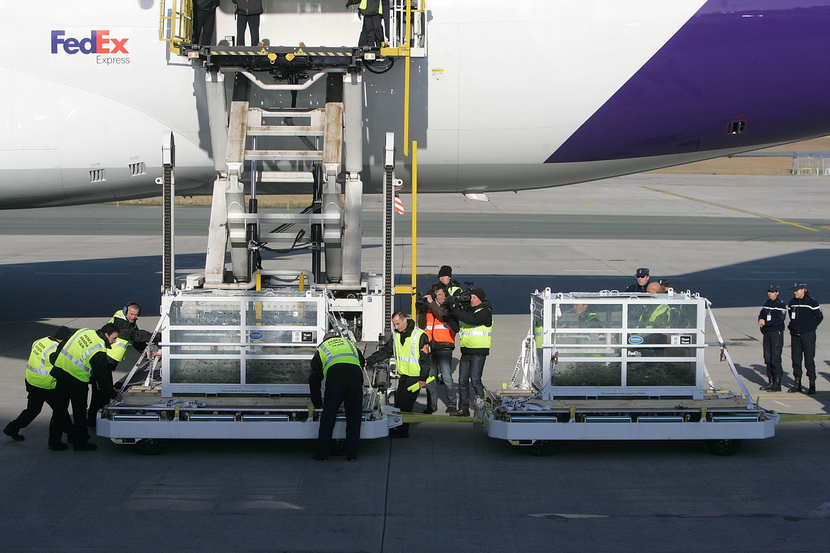 2012年1月15日,运送赴法大熊猫“欢欢”和“圆仔”的联邦快递专机于当地时间12点到达法国戴高乐机场。