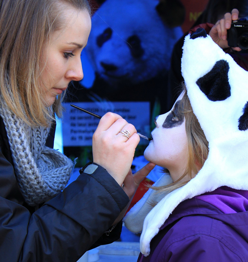 2012年1月15日,法国圣艾尼昂市博瓦勒动物园,当地群众打扮成熊猫的模样,等候大熊猫的到来。