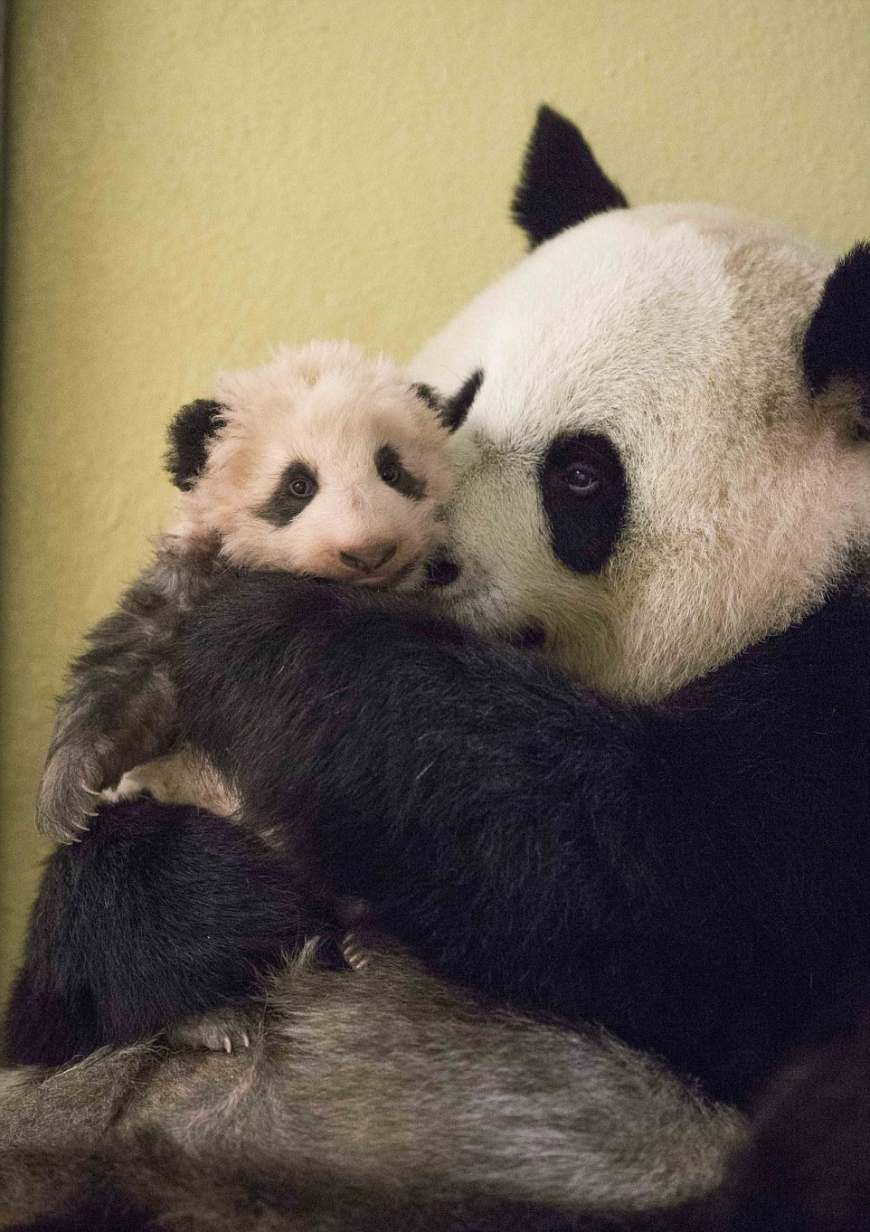 2018年1月,五个月大的“圆梦”依偎在妈妈“欢欢”的怀里。