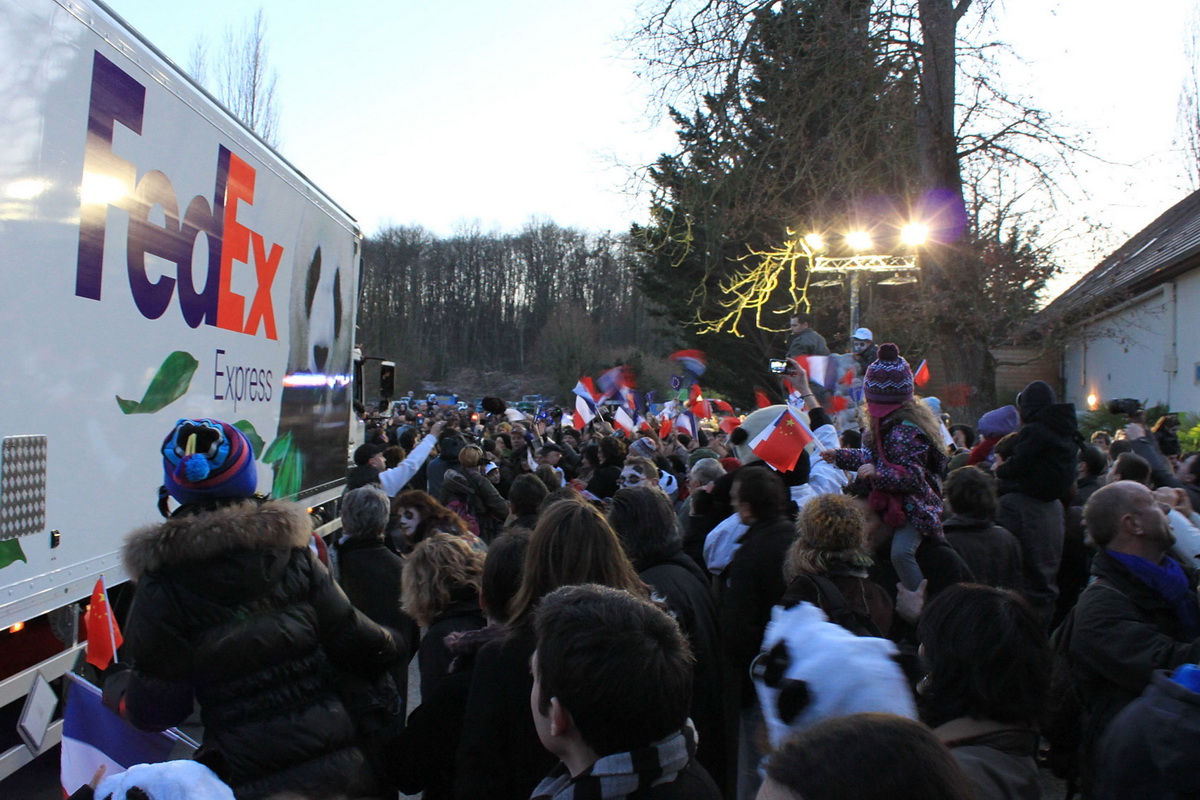 2012年1月15日19时许,赴法大熊猫“欢欢”和“圆仔”到达法国圣艾尼昂市博瓦勒动物园,受到当地群众的热烈欢迎。