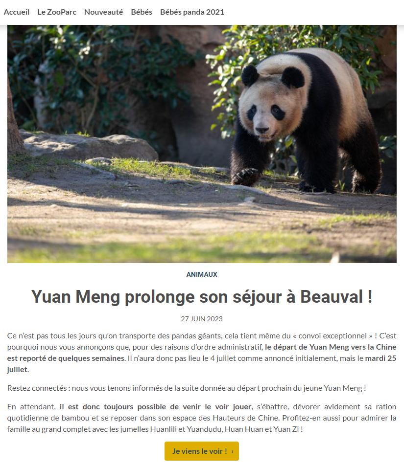 大熊猫“欢欢”(雌性)和“圆仔”(雄性)于2012年在中法大熊猫繁育合作计划框架下由成都大熊猫繁育研究基地出借给法国,该计划为期10年,本应在2022年到期,但因疫情延迟到2024年。今年4月9日,博瓦勒动物园园长在结束跟随法国总统马克龙的访华行程后宣布,“欢欢”和“圆仔”的租期将延长至2027年。