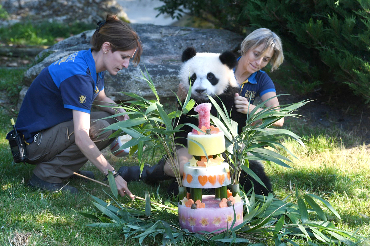 2018年8月4日,法国博瓦勒动物园,“圆梦”迎来1岁生日,动物园准备三层蛋糕为其庆生。