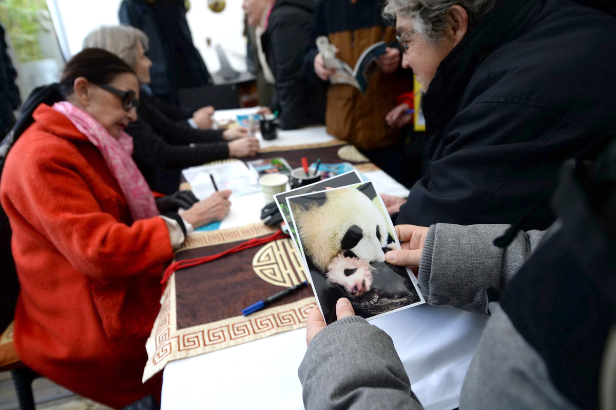 2018年1月13日,法国圣艾尼昂市博瓦勒野生动物园,动物园创始人弗朗索瓦·德洛德(左)在“圆梦”和母亲“欢欢”的照片上签名。这是“圆梦”首次公开亮相。