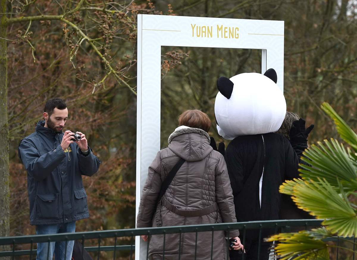 2023年4月28日,法国圣艾尼昂博瓦勒动物园,游客参观大熊猫“圆梦”。