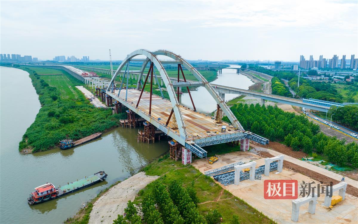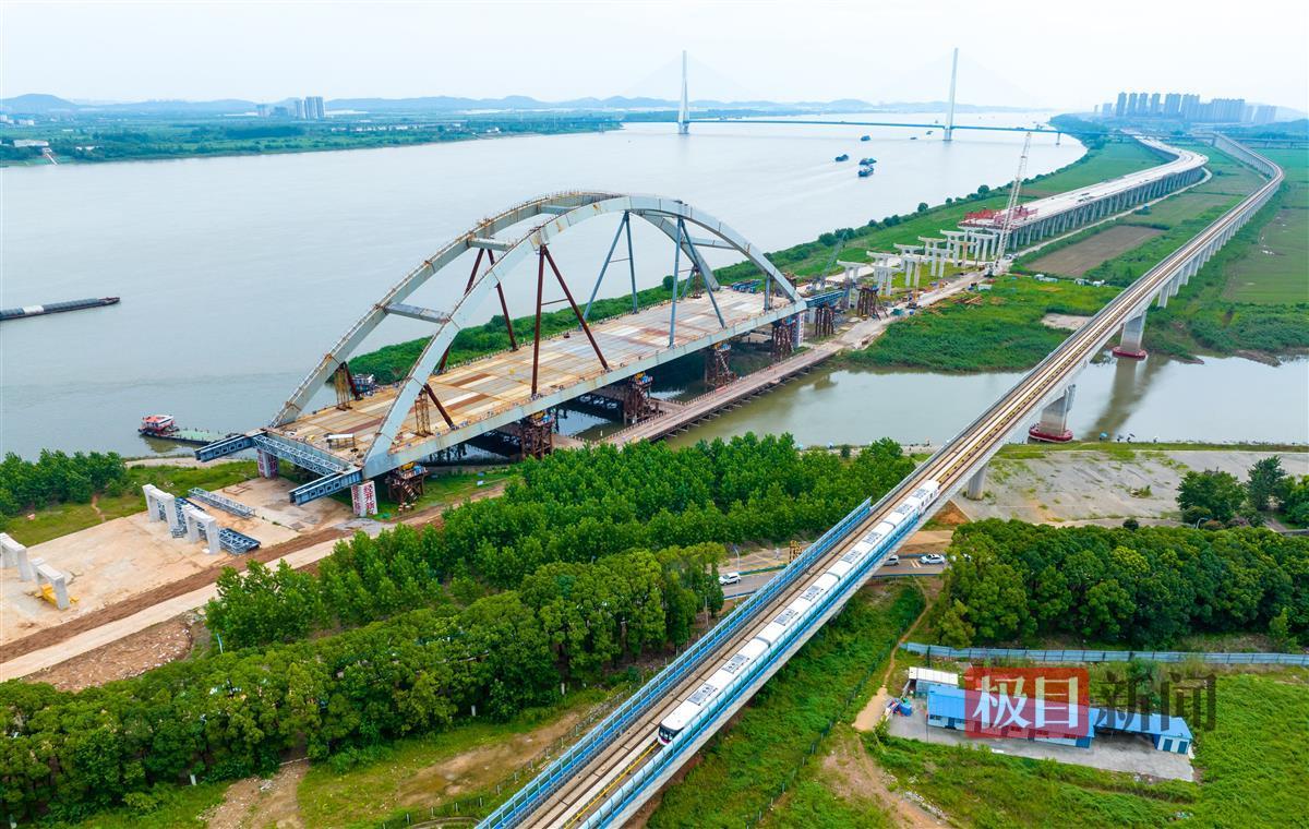 7月9日,俯瞰建设中的武汉左岸大道(万家湖南路——小军山段),重达近8000吨的跨通顺河主桥桥体已经顶推跨过河道。