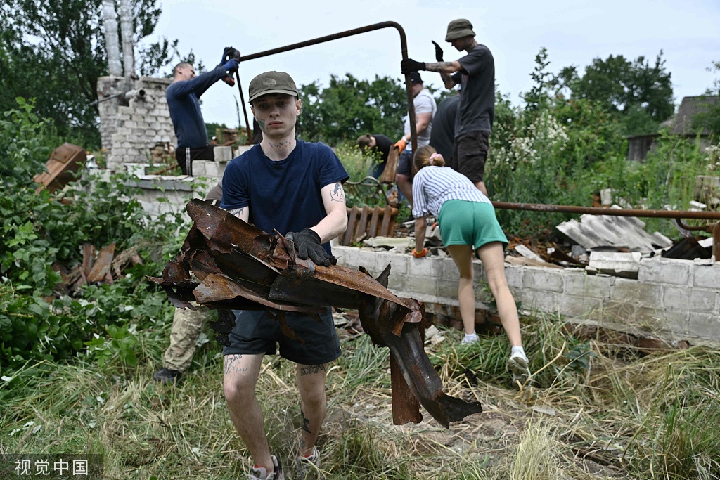 当地时间2023年7月8日,乌克兰切尔尼戈夫地区Shestovitsa村,慈善组织“一起修复”的志愿者正在清理被毁建筑的废墟。