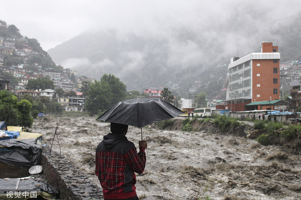 当地时间2023年7月9日,印度喜马偕尔邦,一名男子看着暴雨后溢水的双鱼河。据当地报道,暴雨引发山体滑坡,房屋受损,造成人员伤亡。据印度媒体报道,过去24小时内,印度北部6个邦至少有15人丧生。
