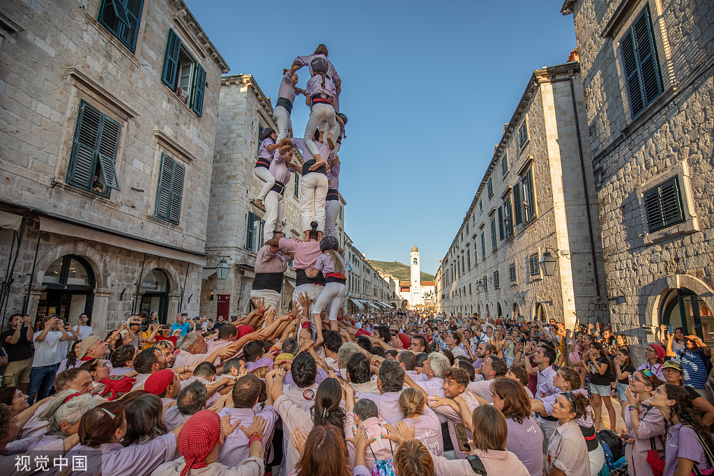 当地时间2023年7月8日,克罗地亚杜布罗夫尼克,Terrassaminiyons的成员站在彼此的肩膀上,进行传统的加泰罗尼亚“叠人塔”活动。