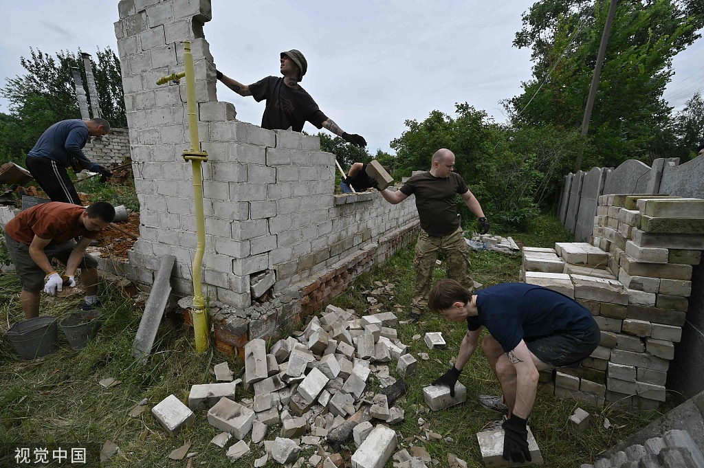 当地时间2023年7月8日,乌克兰切尔尼戈夫地区Shestovitsa村,慈善组织“一起修复”的志愿者们从被毁的建筑中收集可用的砖块。