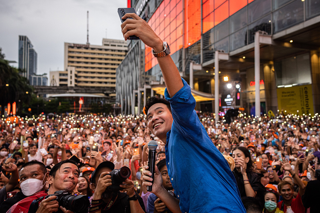当地时间2023年7月9日,泰国曼谷,在7月13日议会举行总理选举之前,远进党总理候选人皮塔在一次集会上与支持者自拍。