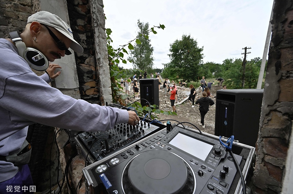 当地时间2023年7月8日,乌克兰切尔尼戈夫,一名DJ为“一起修复”慈善组织的志愿者打碟,这些志愿者在收集被毁文化中心的可用砖块。