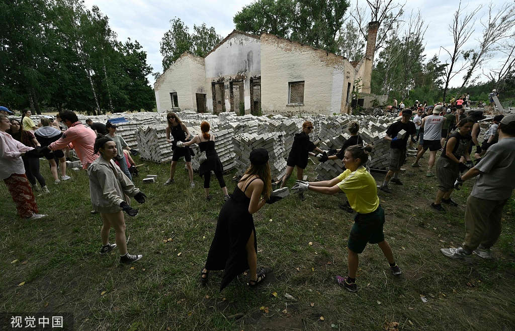 当地时间2023年7月8日,乌克兰切尔尼戈夫,慈善组织“一起修复”的志愿者们在被毁的文化中心收集可用的砖块。
