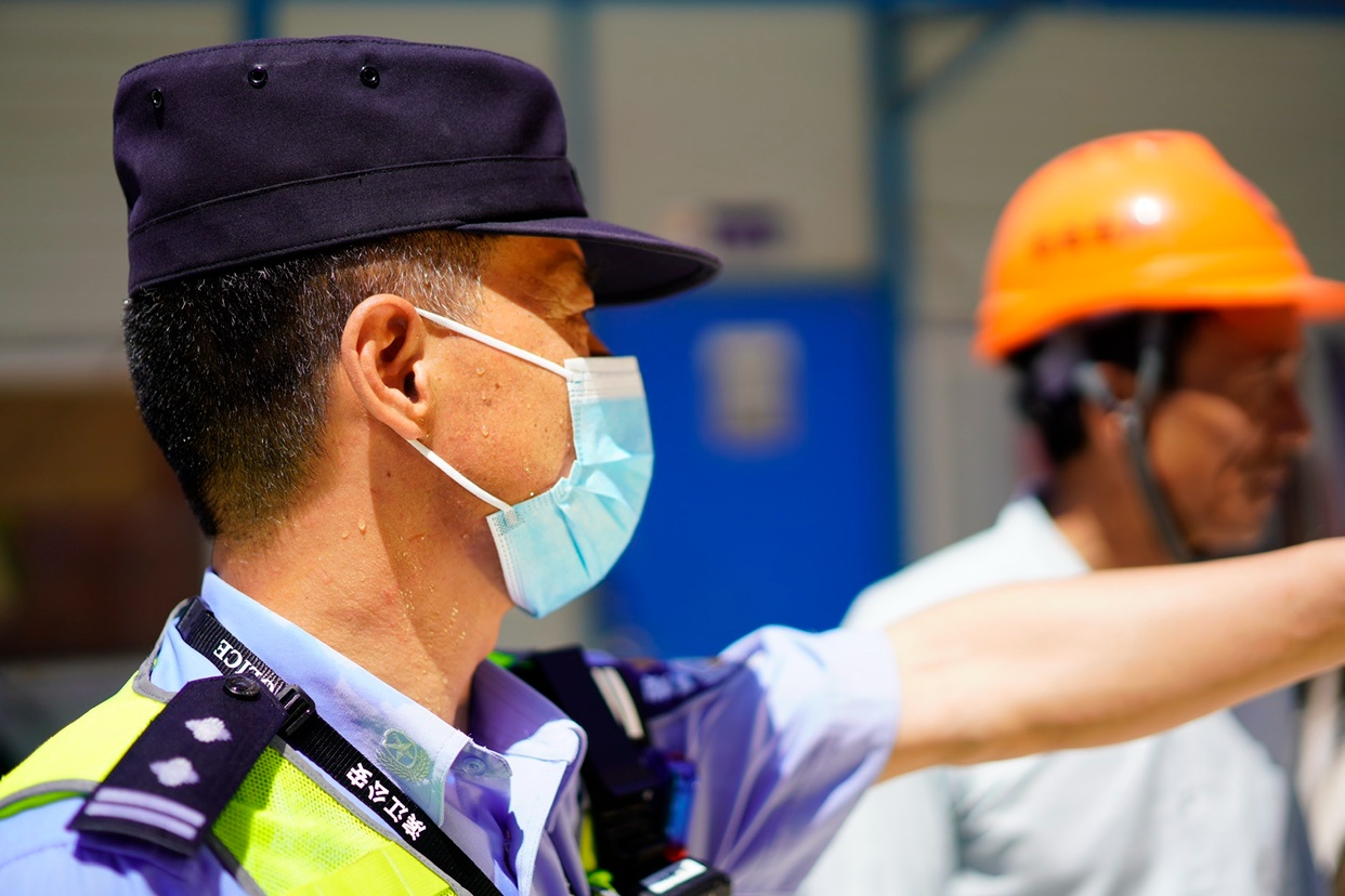 滨江分局浦沿派出所社区民警马爱新正顶着烈日在工地指导建筑工人安全施工,留下的是汗水,也留下了一份对百姓的赤诚之心。