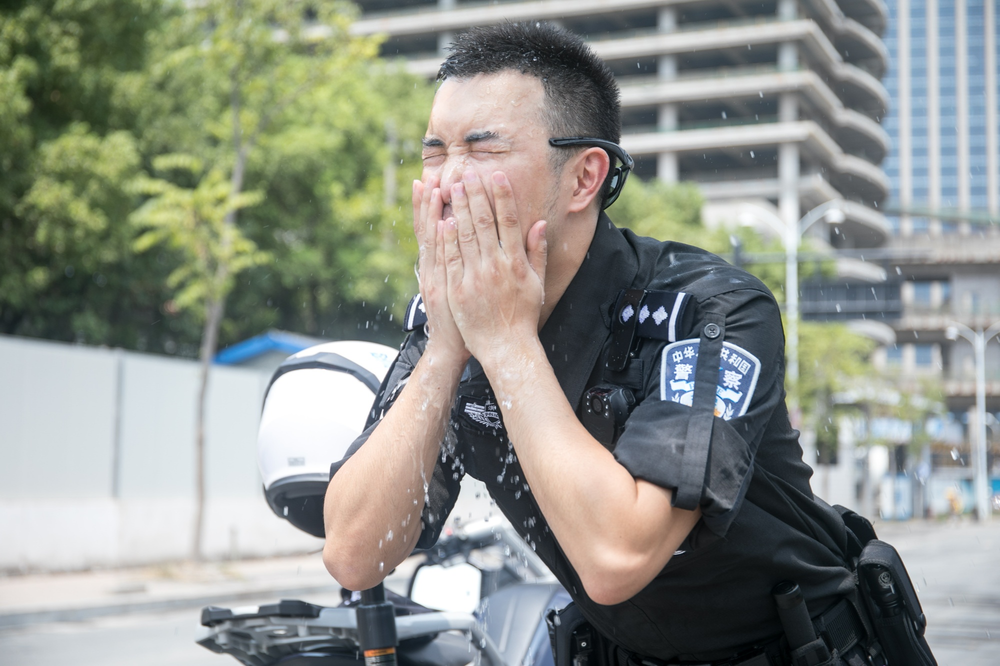 滨锋铁骑的队员们迎来了午休,喝一口凉水、洗一把脸,整装待发迎接新的工作。