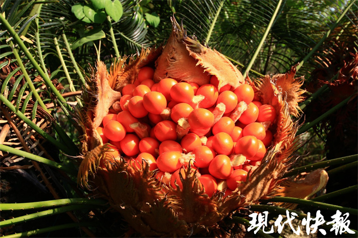 据悉,铁树学名苏铁,别名凤尾蕉,凤尾松等。雄株铁树和雌株铁树开花结果时间各不相同,雄株6至8月开花,花为圆柱形。雌株8月下旬至9月开花,花为扁绒球状,结出无数个鸽蛋般大小橘红色的果儿,鲜艳好看,别名“凤凰蛋”,故有人将雌铁树开花称为“凤凰抱蛋”。