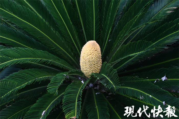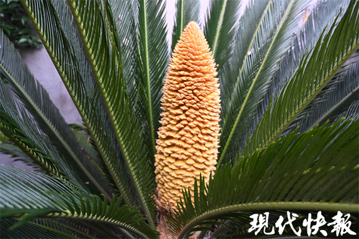 现代快报记者了解到,朱大还家中有2棵铁树,一棵雄株,一棵雌株,都已有30多年的树龄,生长得很茂盛,树高近2米,树径约有40厘米。拨开雄株铁树叶子,只见黄灿灿的柱形花伫立在铁树中心,宛若一颗超大玉米,看上去很是喜人。