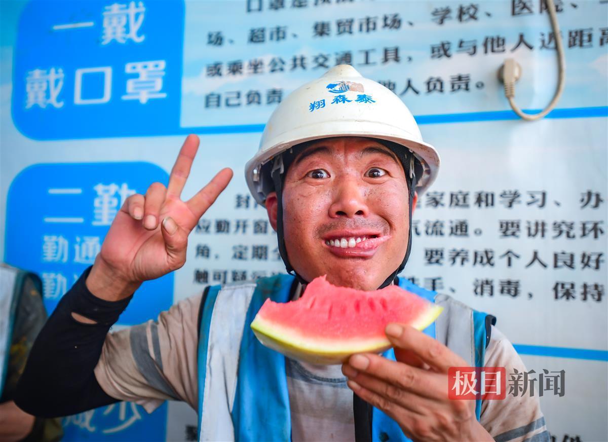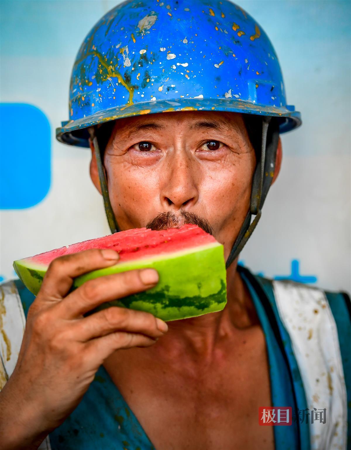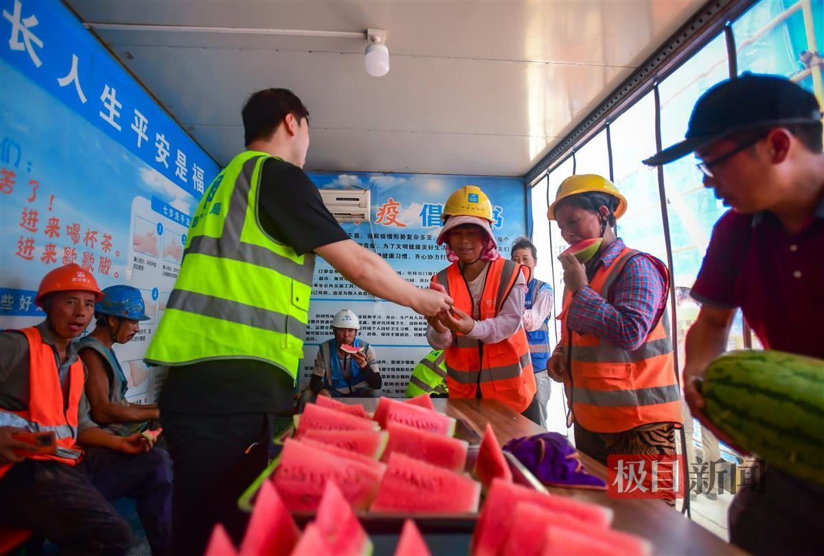 7月11日,秦园东路湖北工人文化宫(职工之家)项目部纳凉室内,民工们吹着空调,吃着西瓜,丝丝清凉沁入心脾。高温下的工友,来这里歇会儿,解解暑气,甩掉一身疲劳……