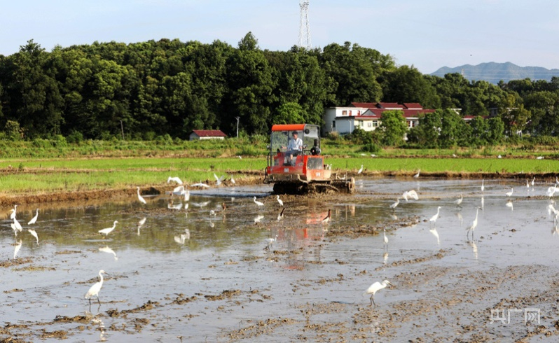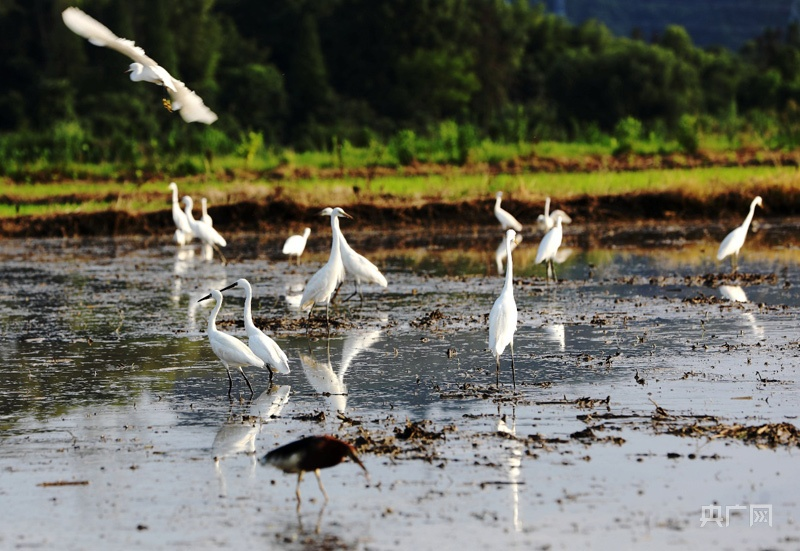 在江西省新余市分宜县分宜镇收村村的稻田里,农户在田地里耕作,身边是成群结队的白鹭在稻田里觅食。生态环境的持续改善,吸引了越来越多的鹭鸟来此栖息。(央广网发袁建兵摄)