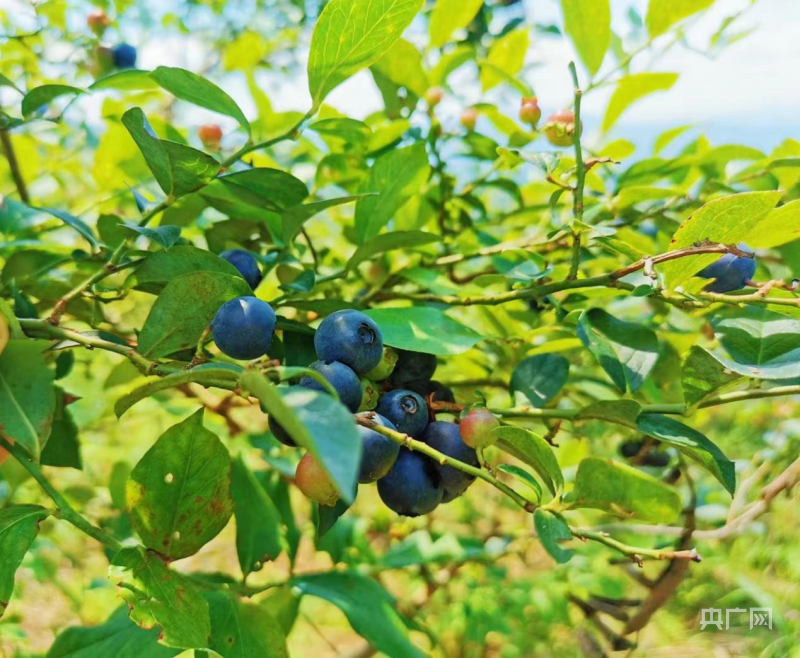 广西柳州市融水苗族自治县白云乡高兰村蓝莓种植基地,1380多亩蓝莓已进入挂果采摘期,一颗颗圆润饱满的蓝莓悬挂枝头。(央广网发兰堃摄)
