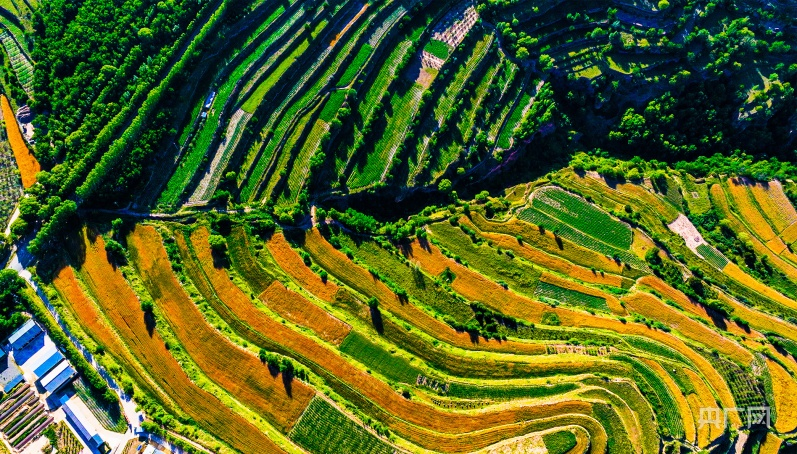 甘肃省平凉市庄浪县的26万亩小麦渐入成熟期,即将开镰收割。图为航拍庄浪县柳梁镇赵岔村小麦种植基地和饲草玉米种植基地。(央广网发李鼎摄)