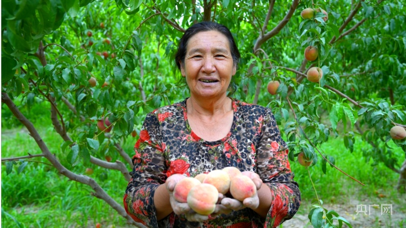 新疆若羌县铁干里克镇的桃园里,长势喜人的桃子挂满枝头,果农们穿梭果园,享受采摘的乐趣,喜迎丰收。(央广网发若羌县融媒体中心供图)