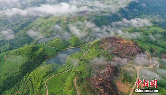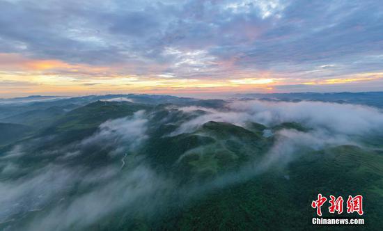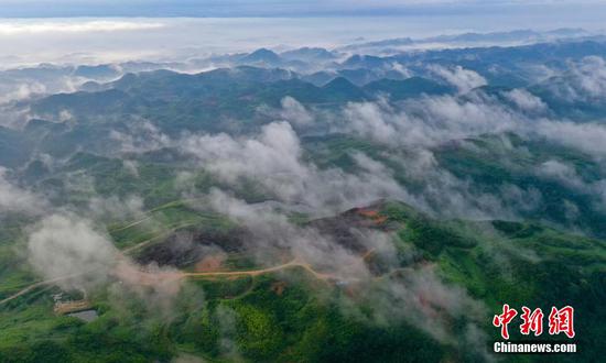 航拍松桃苗族自治县盘石镇红石林景区,雨后云雾缭绕。龙元彬摄