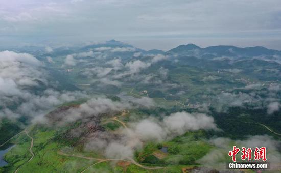 夏日雨后天晴,航拍贵州省铜仁市松桃苗族自治县盘石镇红石林景区,云雾缭绕,青山绿水、苗寨、风力发电机交相辉映,构成一幅幅夏日乡村画卷。