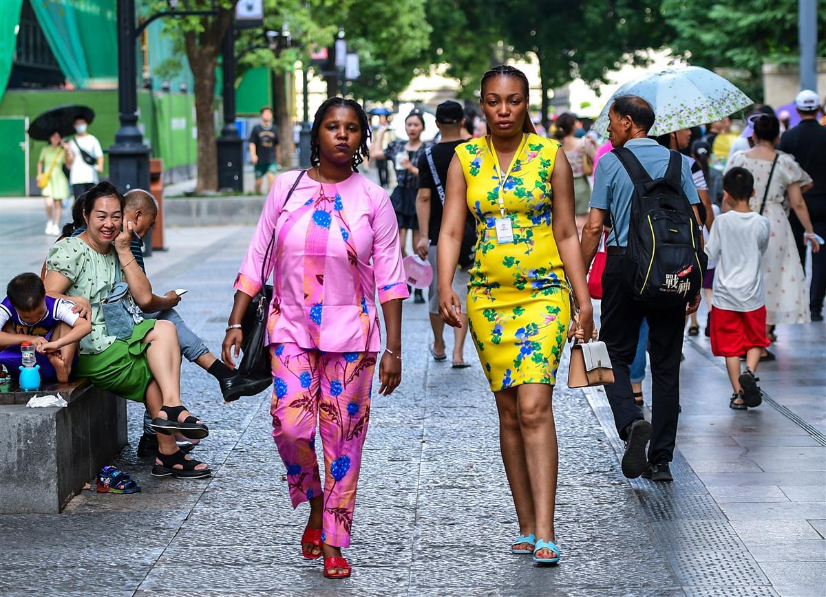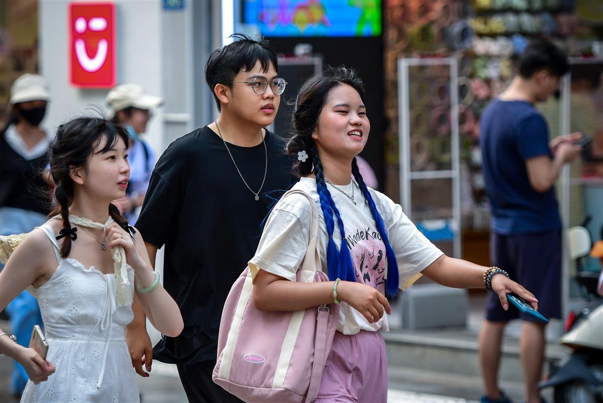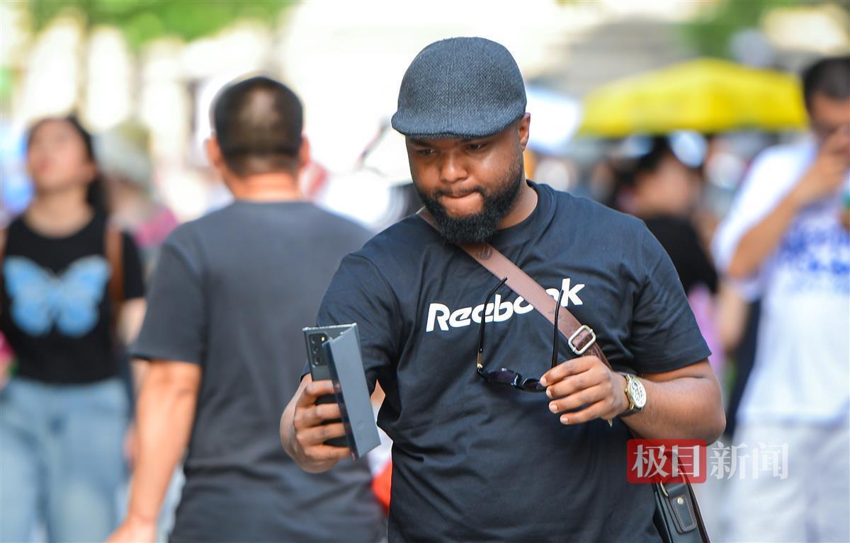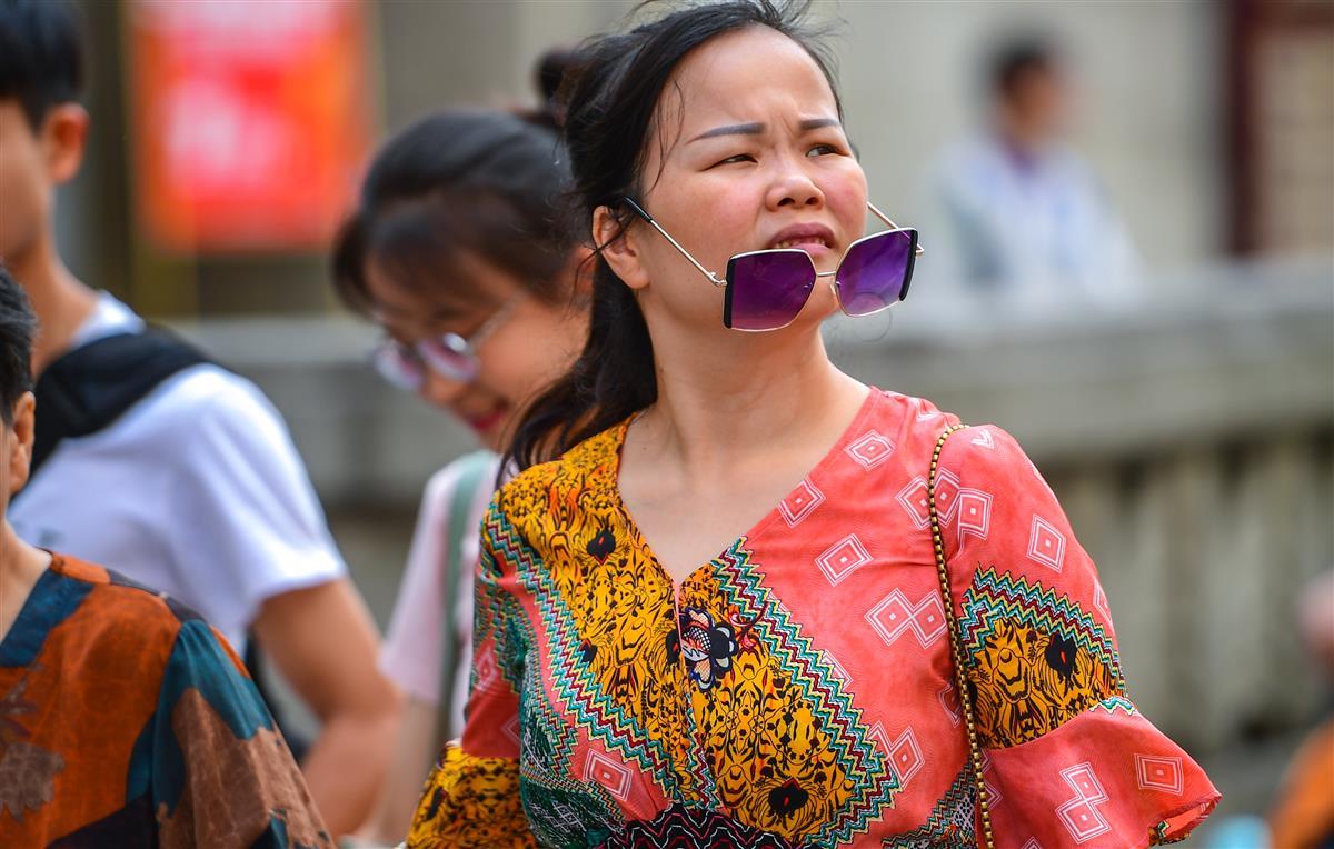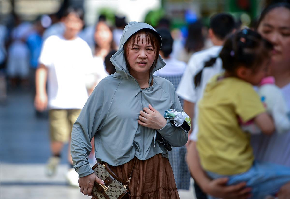7月23日,武汉江汉路步行街人气火爆,骄阳下前来逛街的人川流不息,大家戴着墨镜、戴着遮阳帽、打着遮阳伞、手臂穿戴着遮阳冰袖,尽可能地做好防晒措施,满怀激情,前来逛街,在高温中享受着逛街带来的欢乐。