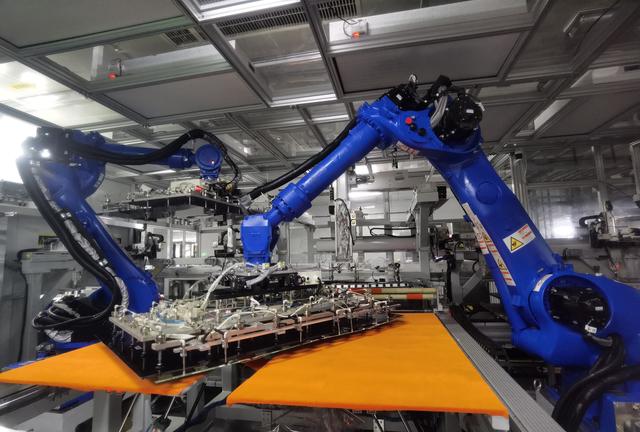 在位于青岛的海信视像智能车间的生产线上,机器人对液晶面板和背光板自动化精准卡合(6月19日摄)。新华社记者 王凯 摄