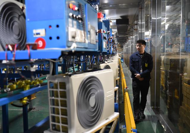工人在美的家用空调广州工厂的生产车间巡视(3月3日摄)。新华社记者 邓华 摄