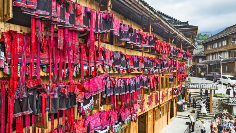 瑶族群众在吊脚楼上晾晒的花衣花裙。(央广网发王战飞摄)