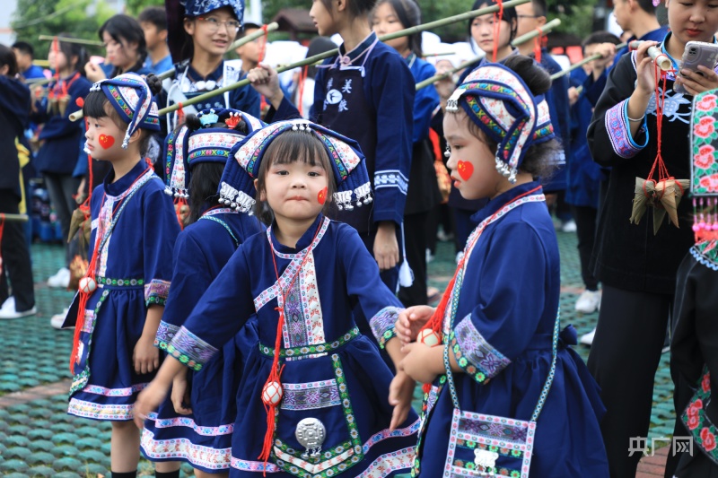 贵州省黔南州长顺县鼓扬镇在庆祝布依民族文化节,来自四面八方的少数民族同胞相约酒歌飘香的醉美鼓扬镇,共享欢乐时光,布依族的小朋友也来参加踩街仪式。(央广网发长顺县融媒体中心供图)