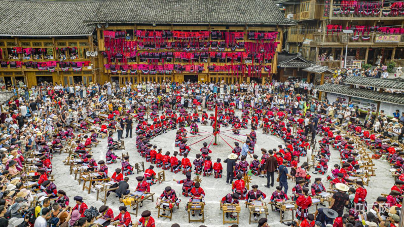 7月23日,农历六月初六。广西桂林市龙胜各族自治县龙脊镇大寨村迎来了传统节日“晒衣节”。红瑶同胞晒花衣、梳长发、在歌舞场向游客展示红瑶服饰的制作工艺。(央广网发王战飞摄)