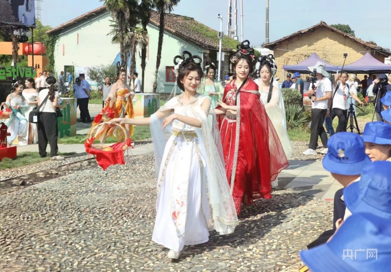 江西省抚州市金溪县迎来蜜梨季,一系列文化活动相继举行,身着汉服的“七仙女”给游客送来祝福。(央广网发抚州市融媒体中心供图)