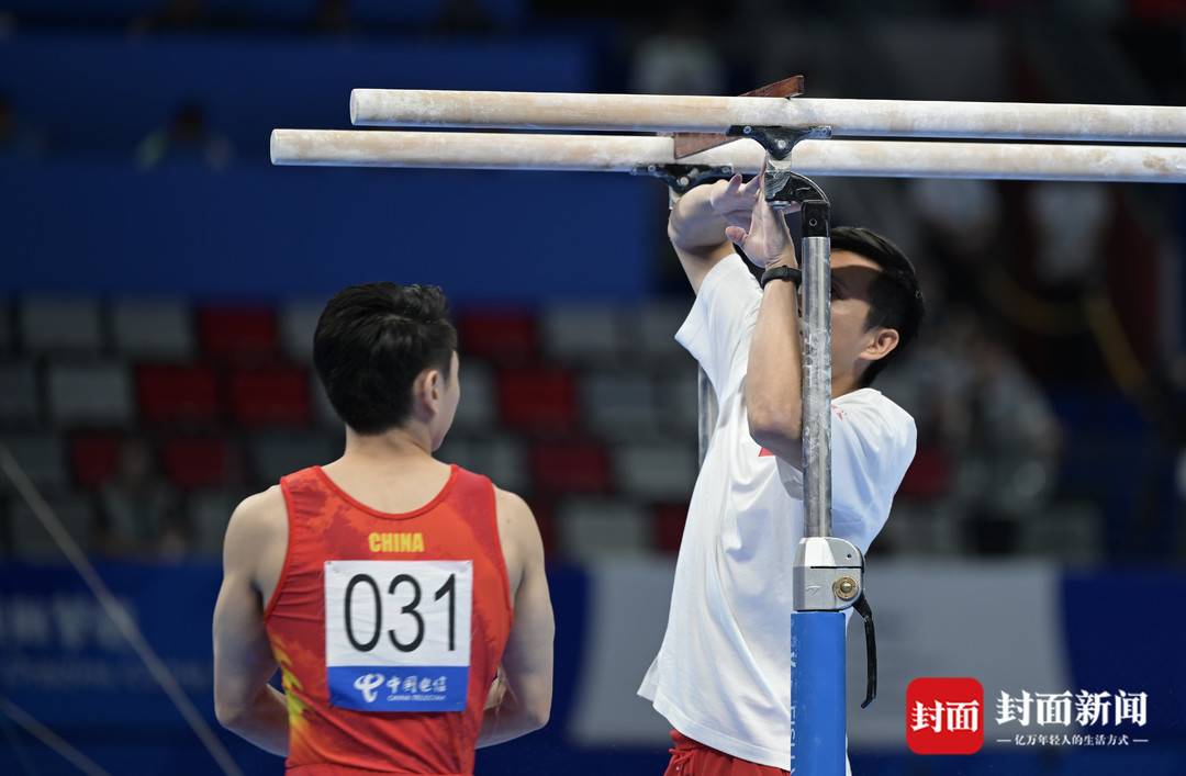 教练协助邹敬园调试双杠