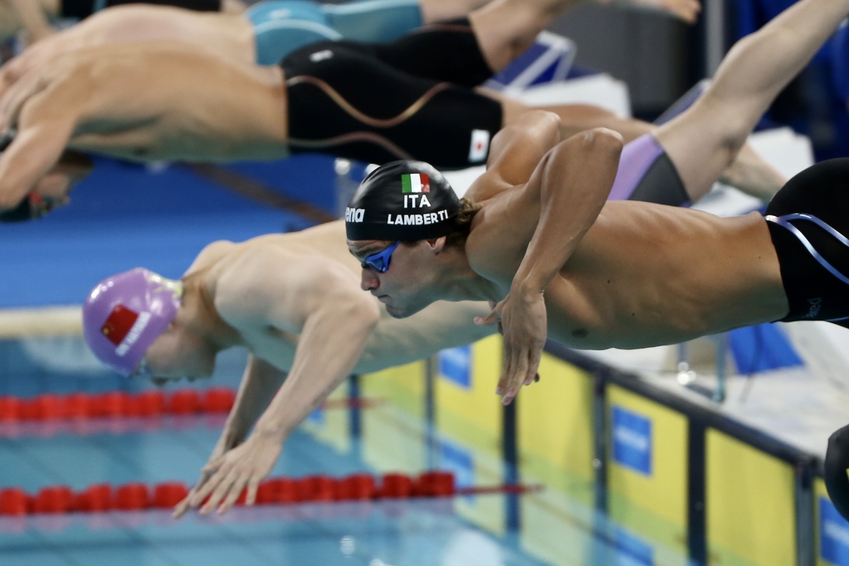 8月4日,参赛选手起跳入水。中国日报记者张威摄起跳入水。