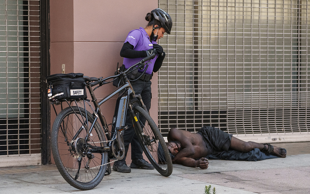 当地时间2023年7月27日,美国洛杉矶,一名穿紫色衣服的巡逻保安在检查一名无家可归者的健康状况。