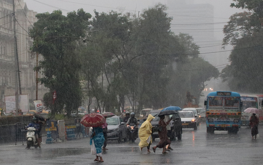 当地时间2023年8月1日,印度加尔各答,人们在大雨中行走。