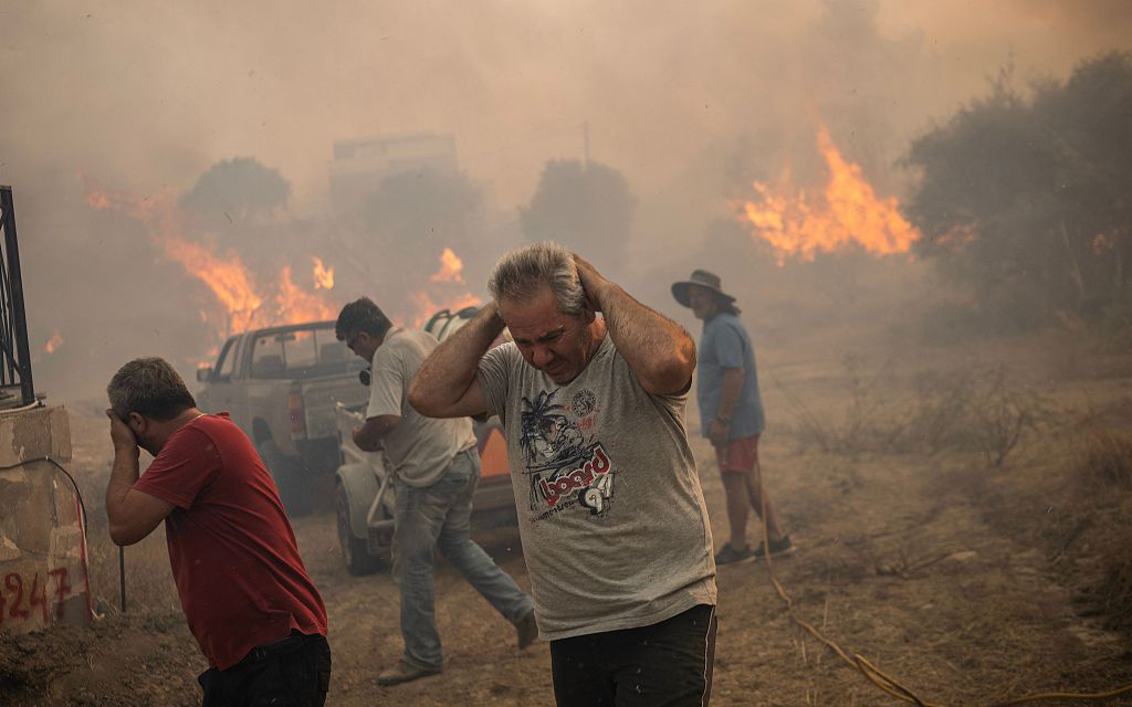 当地时间2023年7月25日,希腊爱琴海,山火烧毁了罗德岛的村庄,人们逃离家园。