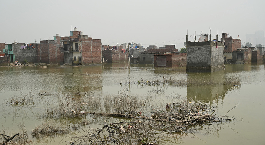 当地时间2023年7月29日,印度法里达巴德,亚穆纳河洪水淹没了人们的房屋。