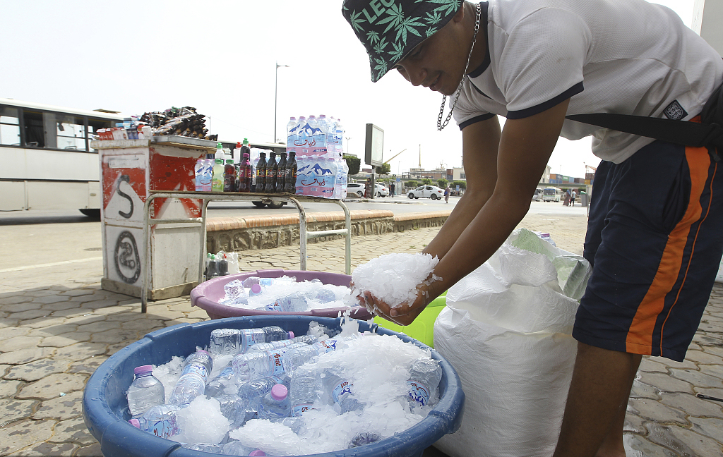 当地时间2023年7月8日,阿尔及利亚阿尔及尔,街头小贩把一些冰块放在瓶装水上,当天气温高达30摄氏度(86华氏度)。