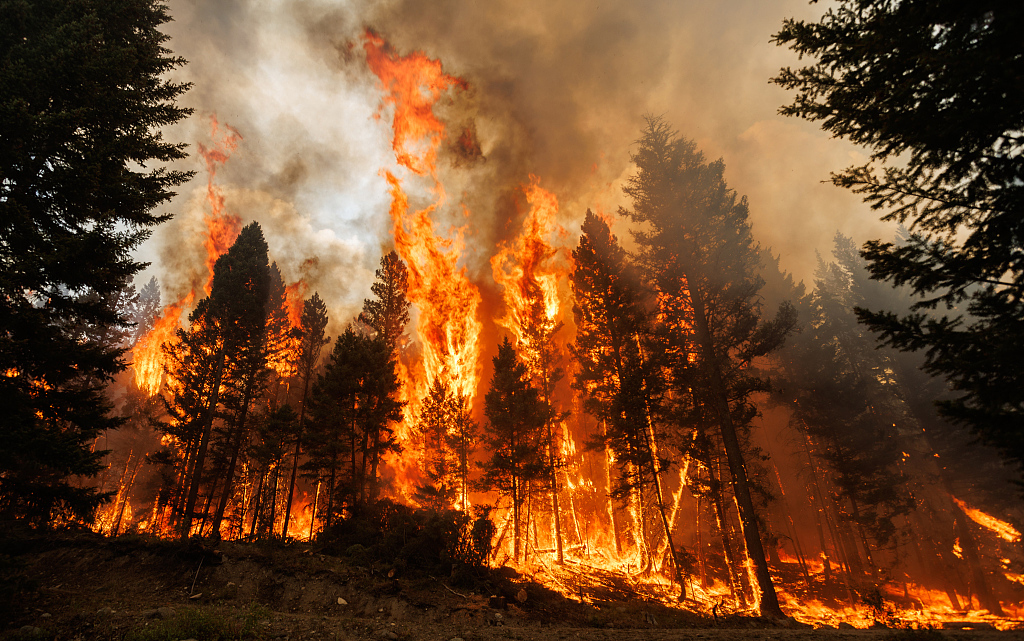当地时间2023年7月28日,加拿大坎卢普斯,风向变化让山火燃烧加倍。