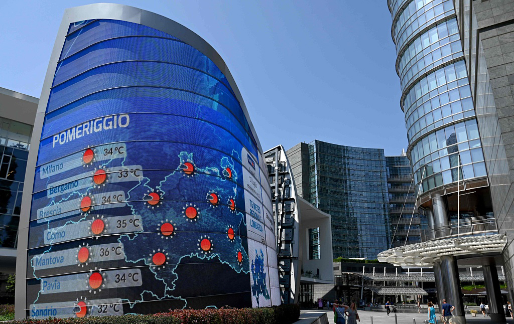 当地时间2023年7月17日,意大利米兰,街上屏幕显示气温。