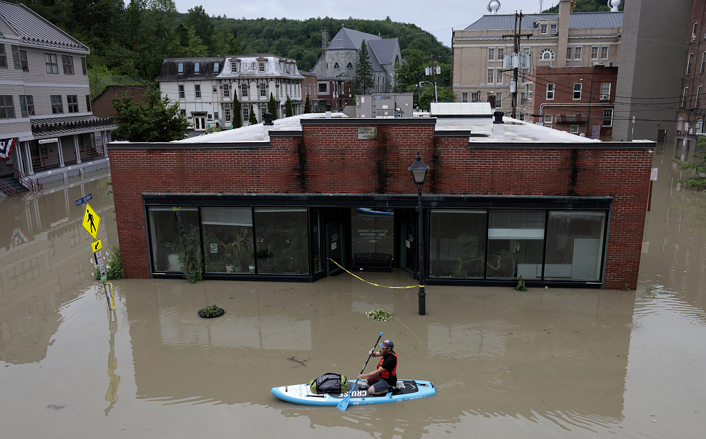 当地时间2023年7月11日,美国佛蒙特州发布洪水警报,街道变汪洋,人们划船撤离。