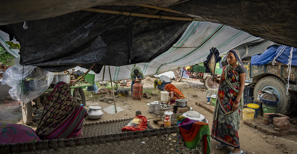当地时间2023年7月27日,印度新德里洪水泛滥,人们住在用塑料布搭建的临时避难所。