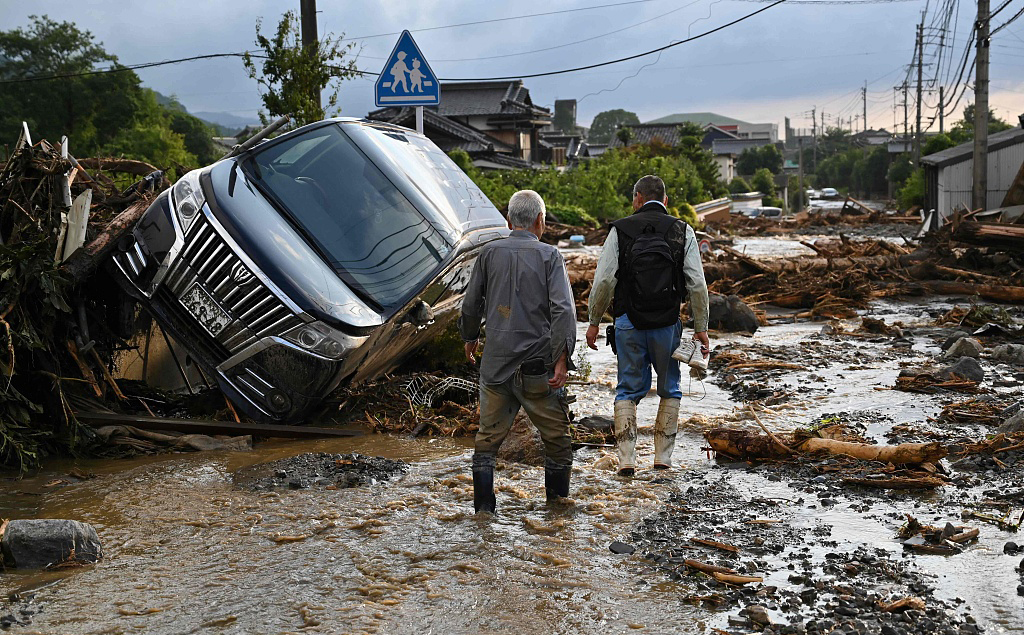 当地时间2023年7月10日,日本九州,遭受暴雨袭击后,居民走在被水淹过的道路上。