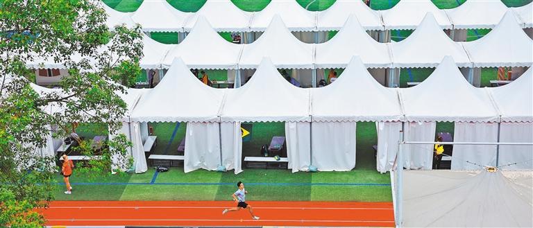 作为一座2008年建成投用的老场馆,成都双流体育中心在改造升级过程中,采用临建的方式,在比赛场外侧的田径训练场布置了79顶白色帐篷,用于运动员的休息、热身。